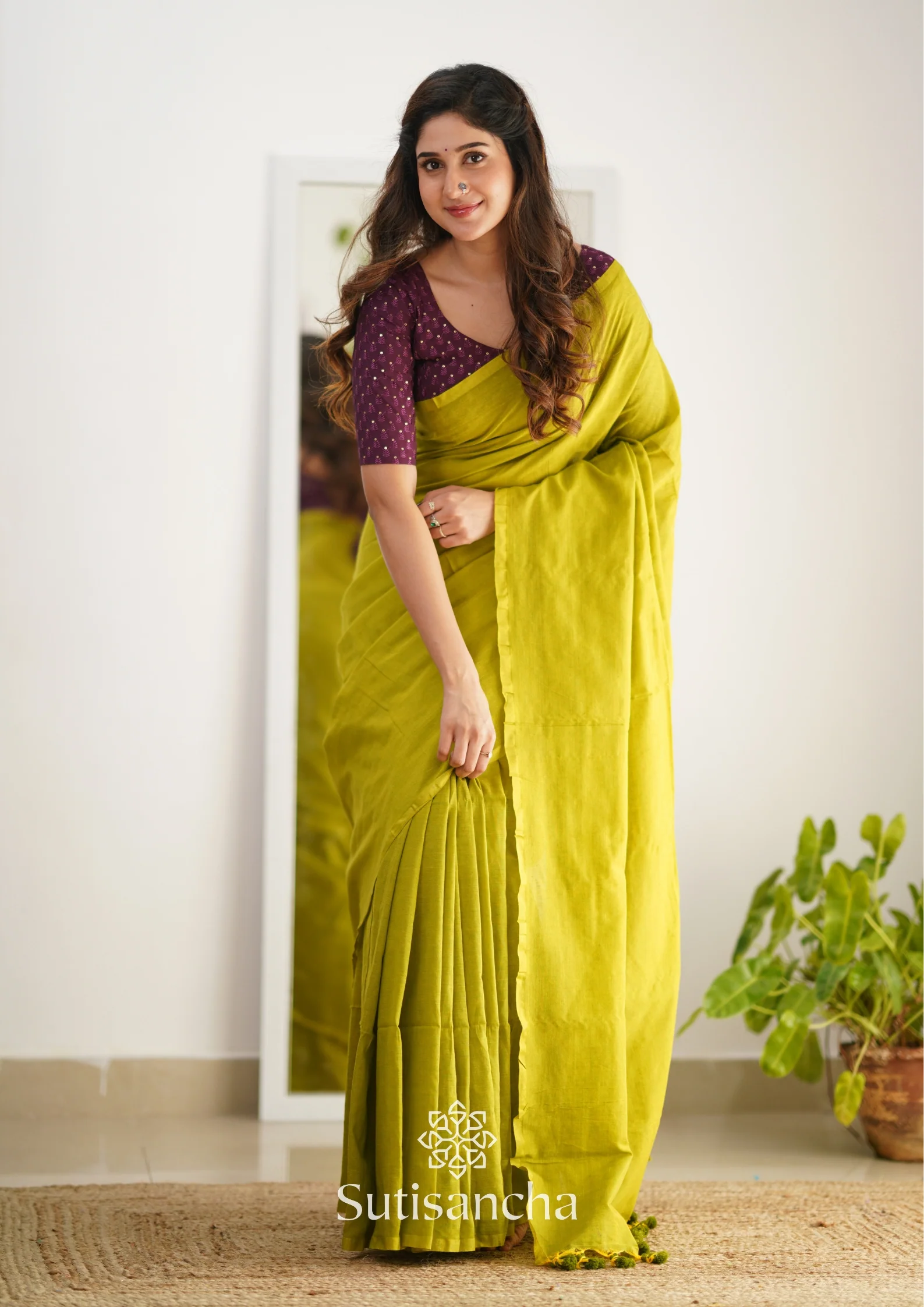 Sutisancha Lime colour Handloom Cotton Saree with Designer Blouse
