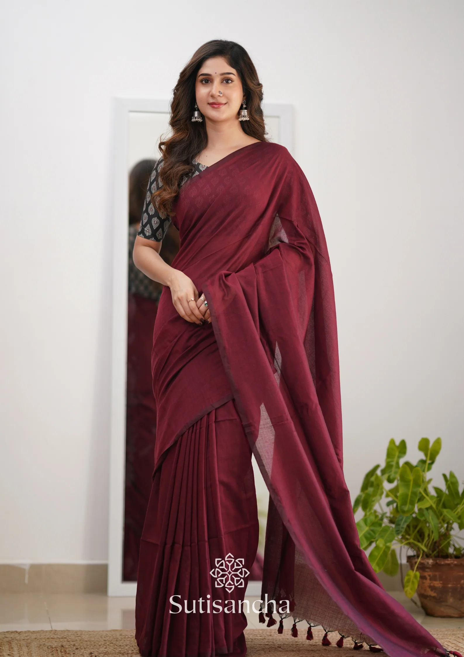 Sutisancha Maroon Handloom Cotton Saree Saree With Designer Blouse